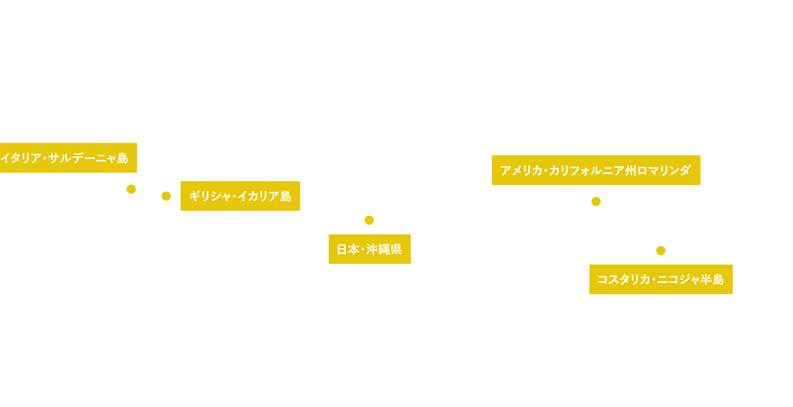 国際的な自然科学商業誌「ナショナル・ジオグラフィック」の記者・冒険家であるダン・ビュイトナーは、ブルーゾーンという言葉に触発され、この言葉を日本の沖縄、アメリカ・カリフォルニア州のロマリンダ、コスタリカのニコジャ半島、ギリシャのイカリア島に広げ、各国の研究者、医師らの協力によりブルーゾーンを人口統計学的に確認された長寿の場所の国際的呼称として確立した。